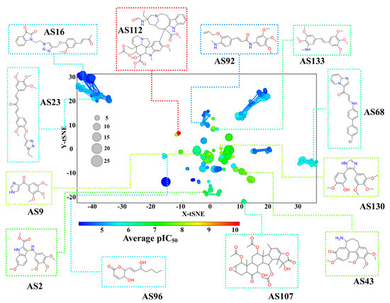 The constellation plot in Figure 7 shows the clear identification of “dark regions” in the SAR in the chemical space of Tub-Mts inhibitors, e.g., the analog series in light blue with low average pIC50 values: AS16, AS23, AS68, AS92 and AS96. The plot also aids the identification of promising analog series or “emerging bright stars” in the chemical space, e.g., the analog series in green-to-red color with high average pIC50 values, AS2, AS9, AS43, AS112, AS130, and AS133. Although these analog series have been explored on a limited basis (between two and three compounds, as depicted by the smaller size of the data point in Figure 7) they have a high average activity. Thus, these analog series could be the future of new and potent inhibitors. However, and despite their high average activity, some series (e.g., AS112) could still have limitations such as their difficult synthetic accessibility or poor pharmacokinetic profile.