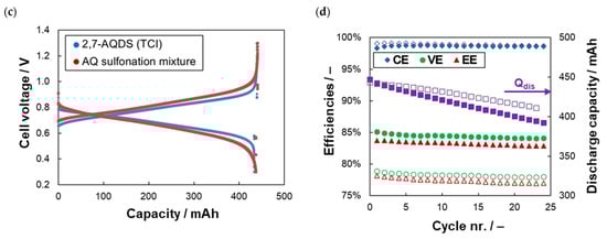 Firstly, the electrochemical performance of AQDS-based electrolyte directly prepared from AQ sulfonation mixture was tested in AQDS-HBr single-cell using 3.0 M HBr positive electrolyte according to [5,7,8] and its parameters were compared with 2,7-AQDS-based electrolyte to see whether the sulfonation mixture can be directly used without time and energy demanding separation of 2,7-AQDS isomer. The experimental procedure consisted of EIS and load curve characterization of the single-cell in 50% SoC followed by a series of 50 galvanostatic cycles at 125 mA cm–2 in corresponding voltage limits. The performance of both cells are mutually compared in Figure 1 and Table 1. The cell containing AQ sulfonation mixture exhibited slightly higher over-all polarization (Rdis of 0.58 Ω cm2 vs. 0.44 Ω cm2 for 2,7-AQDS based negolyte) due to almost double RCT (0.38 Ω cm2 vs. 0.18 Ω cm2). This is probably related to the presence of 2,6-AQDS in the anolyte potentially exhibiting slower reaction kinetics. Rohmic of both batteries was around 0.2 Ω cm2. The higher over-all resistance of the battery based on AQ sulfonation mixture resulted in approx. 6% lower EE at 125 mA cm−2 (77.2% vs. 83.2%). On the other hand, this battery provided comparable initial Qdis (approx. 445 mAh) and even lower CD (–0.34% Qtheor/cycle for mixed electrolyte vs. –0.45% Qtheor/cycle for 2,7-AQDS based one), which might be related to slower permeation of the mixed electrolyte active compounds through the used PFSA membranes, although in the previous studies, the bromine permeation across the cation-exchange membrane has been identified as the main cause of capacity fade in this system [6,20,21]. In sum, the obtained results proved that the sulfonation AQ mixture can be directly used as acidic electrolyte which can significantly reduce the production costs (approx. to a half or even a third of the standard cost) as the costly separation of 2,6-AQDS and other isomers can be omitted.