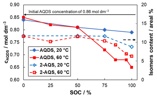 In accordance to the previous results, no new compounds have been identified by HPLC analysis and the molar ratio between individual constituents remained similar for all degradation conditions. The areal % ratio of 2,6-AQDS to 2,7-AQDS increased only slightly with SoC from 0.9 (for 0% SoC samples) to 0.95 (for 100% SoC samples) indicating slightly better stability for 2,6-AQDS isomer. 2,6-AQDS and 2,7-AQDS together initially accounted for approx. 83% of all AQ derivative signals and their content slightly increased after storing for five days at high SoC to 90%. The concentration of sulfuric acid evaluated by acido-basic titration did not follow monotonous trend and changes in concentration are rather minor. The increased sulfuric acid concentration might indicate desulfonation of AQDS leading to reduced solubility and precipitation of desulfonation products (AQS or AQ). However, we did not observe solid precipitate on the bottom of the glass vial and increased content of these compounds was not observed by HPLC. Thus, the desulfonation of AQDS is not likely to significantly contribute to the degradation of electrolyte capacity. Interestingly, the content of monosulfonated 2-AQS, which is present in initial sulfonation mixture at a significant amount, decreased with increasing electrolyte SoC which is graphically shown in Figure 4. The capacity decay is thus at least partially related to decreased content of 2-AQS and thus further attention should be paid to decrease its content in the sulfonation mixture.