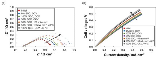 - EIS and LC characterization of FEC and DHC in 50% SoC of AQDS electrolyte was done to monitor the performance evolution of both cells during the experiment. EIS was measured under OCV conditions with 5 mV amplitude in frequency range of 10 kHz–20 mHz. Load curve was measured using current scan from 0 to 500 mA cm−2 with 5 mA cm−2 s−1 scan rate.