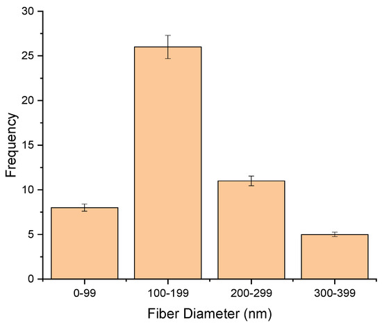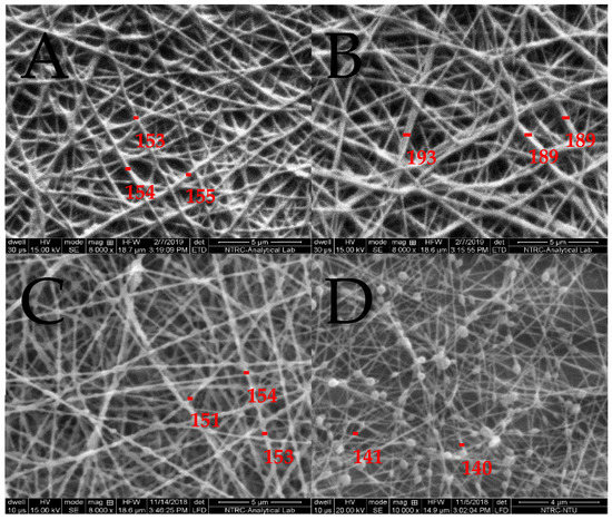 The morphology of the fibers is given in Figure 1. In the preparation of CEO-loaded NFs, PEO was used in combination with CS as CS alone is not spinnable owing to its structural entanglements. Amounts of 0.5% and 1% CEO were added to the spinning solution. Figure 1A is the fiber formed using 0.5% CEO, and 1B resulted from 1% of CEO. The fiber diameter was measured using ImageJ software, which showed that by increasing the percentage of CEO, the fiber formation was not affected; however, the thickness of fibers increased from 154±35nm resulting from 0.5% CEO to 189 ± 43 nm resulting from 1% CEO. The increase in the thickness of fiber as shown in Figure 2 may be due to a decrease in electrical conductivity of the solution and increase in solution viscosity because of some interactions between the CEO and PEO [10,21]. Similar results were also reported in a study where the diameter of NFs increased by increasing the percentage of loaded clove essential oil from 1.5–6% (w/v) [10]. Fish oil was encapsulated in polyvinyl alcohol NFs and reported that by increasing the percentage of loaded oil, the thickness of fibers increased [22]. Candeia essential oil was encapsulated in polylactic acid and it was found that increased average diameter of fibers formed by increasing the concentration of candeia oil [23]. However, another study reported that during the fabrication of peppermint oil nanocomposites using polycaprolactone, the average diameter of the fibers decreased by using a high percentage of the oil [10]. It is observed from Table 2 that an increase in the concentration of CS results in an increase in viscosity and decrease in conductivity; this change in viscosity and conductivity also affected fiber formation. Only a 50:50 ratio of CS and PEO resulted in smooth, beadless fibers. As the concentration of CS increases, the solution becomes more viscous and difficult to spin, resulting in beaded structures.
