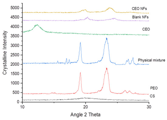 XRD analysis is shown in Figure 4. CS is amorphous in nature, thus did not show any sharp spike, but has a broad peak at 2θ of 18–220 which is because of its degree of crystallinity due to its amorphous shape [27,28]. PEO shows some sharp spikes at 19.12, 23.25, 26.17, and 26.87, which is attribute to its crystalline nature. In the case of CEO, there is one broad peak at 11.45–13.35 that does not show any sharp spike in any other position, it being a viscous liquid in structure. The distinguishing peaks corresponding to the oil and PEO were also observed in the pattern produced by the physical mixture. This suggested that the crystalline components of PEO maintained their crystalline nature in the physical mixture. The XRD pattern of CEO NFs suggests that the diffraction spectrum with the characteristic peak of at 2θ of 19° and 23° confirms the presence of CEO within NFs, as well as the incorporation of PEO as crystalline or semi-crystalline form. The XRD analysis was done to identify the phase transformations and probable interactions due to the infusion of CEO. XRD patterns, as shown in the figure, of the NFs with and without CEO showed diffraction peaks at the same 2θ, and this means there is no phase transformation and reaction because of inclusion with CEO. A similar result was reported during the encapsulation of tea-tree oil. It was reported earlier that concentration of the polymer in the solution largely determines the crystallinity of the NFs formed [23].
