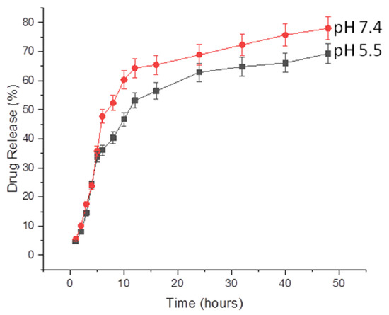 The rate of release of loaded oil from NFs is shown in Figure 5. The release rate was measured at two pH conditions. The release profile was biphasic, showing faster release in the initial 12 hours where approximately 60% of the loaded drug was released, followed by slow and continuous release for the subsequent 36 hours. Initial high release might be caused by hydrophilic behavior of PEO and followed by sustained release due to the presence of CS. As can be seen from the figure, the release rate of CEO is faster in acidic pH (5.5) as compared to physiologic pH (7.4) which might be attributed to a high affinity of CS to dissolve in acidic conditions. Moreover, high release in acidic conditions is also useful in topical formulations and shows the potential to be used topically [35,36]. It was observed that during the initial 12 hours, the release was faster at both pHs; the release profiles were not significantly different (p > 0.05) from each other over this period, but showed significant difference (p < 0.05) after 12 hours. The same results were reported for ciprofloxacin-encapsulated NFs developed for topical burn-wound-healing [37].