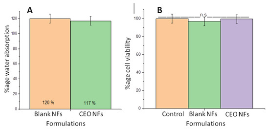 Percentage water absorption by blank NFs and CEO-encapsulated NFs (A) and cell viability percentage blank NFs and CEO NFs against fibroblasts cell lines after 48 hours incubation (n = 6, (ns = p > 0.05) (B).