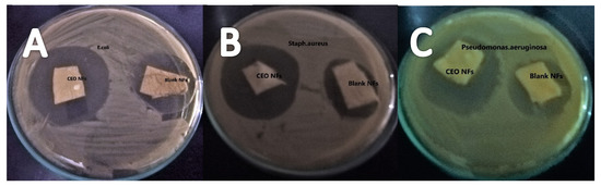 Zone of inhibition of CEO NFs and blank NFs observed against Escherichia coli (A), Staphylococcus aureus (B), and Pseudomonas aeruginosa (C).
