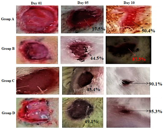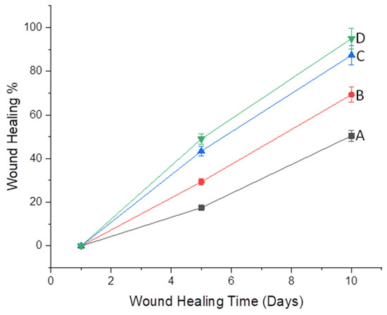 The wound size decreases slowly over a period of time. Wound-healing was slowest in untreated group (A), showing the maximum diameter throughout the study period with wound closure 17.56% and 50.44% on day 5 and 10, respectively, while Group D, treated with commercial product, showed maximum healing of 49.1% and 95.3%, as shown in Figure 9, which showed highly significant (p < 0.001) results when compared to untreated groups, whereas Group C, treated with the CEO NFs, also showed better healing percentage (45.41 and 90.13) on the 5th and 10th day of treatment, which is more significantly different (p < 0.01) from Group A, but less than that of the commercial product, as shown in Table 4. On the other hand, Group B, treated with blank NF formulation, showed some healing properties, which can be attributed to the presence of CS in the NFs confirming its healing capacity resulting from its antibacterial and antioxidant properties. Wound-healing potential of clove oil was also observed using in vitro scratch assay and confirmed the healing potential [10].