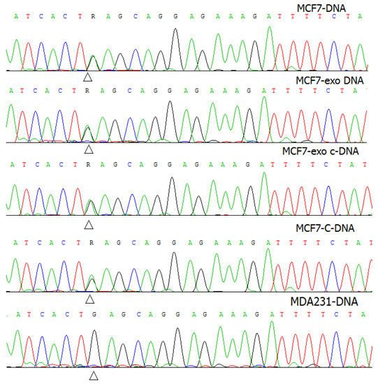Mutation validation by Sanger sequence analysis. The sequence electrophoregrams of the MCF7-DNA, exosomal DNA from MCF7, cDNA from MCF7, and exosomal cDNA from MCF7 contained the PIK3CA mutation c.1633G > A (p.E545K) (R), compared to the MDA-231 DNA.