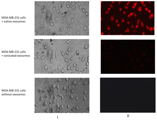 Transferring of fluorescent-labelled compounds by exosomes. MDA-MB-231 cells were cultured without labelled exosomes or with the native or sonicated MCF7 exosomes stained by a fluorescent dye. The efficiency of dyeing exosome incorporation was checked with a fluorescent microscope Nikon Eclipse Ti-E. The images of light (I) and fluorescent (II) microscopy are presented.