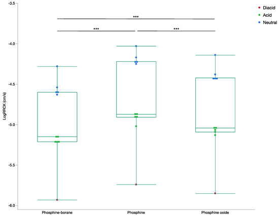 Box plot of LogRRCK permeability by compound step LogRRCK (cm/s) was determined from Maestro for all phosphine-borane, phosphine, and phosphine oxide compounds. Ion states for all compounds are included. (ANOVA, *** p < 0.001).