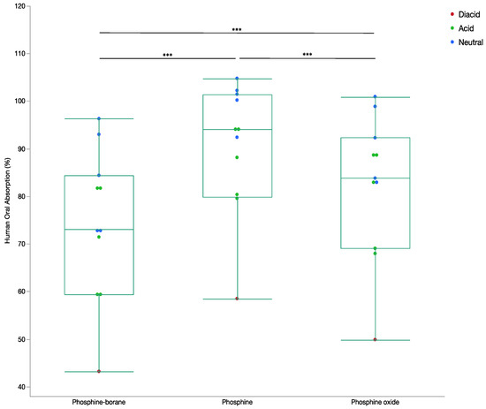 Box and whisker plot of percentage human oral absorption by compound step. The percentage human absorption determined from the presented neural network for all phosphine-borane, phosphine, and phosphine oxide compounds. Ion states for all compounds are included. (ANOVA, *** p < 0.001).