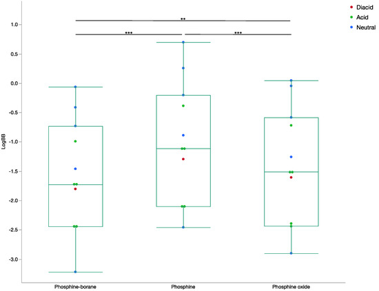 Box and whisker plot of LogBB by compound step. The LogBB determined from the presented neural network for all phosphine-borane, phosphine, and phosphine oxide compounds. Ion states for all compounds are included. (ANOVA, *** p < 0.001, ** p < 0.05).