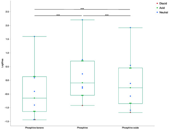 Box and whisker plot of LogKHSA by compound step. The LogKHSA determined from the presented neural network for all phosphine-borane, phosphine, and phosphine oxide compounds. Ion states for all compounds are included (ANOVA, *** p < 0.001).
