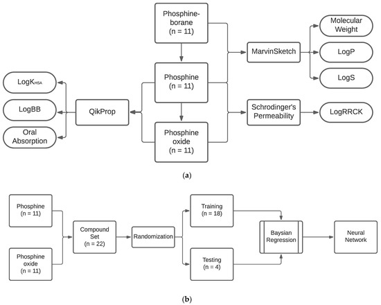 Cellular permeability was determined with the Ralph Russ Canine Kidney (RRCK) cell-based assay Papp prediction available in Maestro 12.4.072. This physics-based model is used to predict RRCK (MDCK-LE) assay logPapp values [12,13,27]. Maestro’s rapid molecular properties tool QikProp was used to predict human oral absorption and the logarithmic brain/blood partition coefficient (logBB). QikProp compares compounds with a library of compounds to find those that are similar to them so that predictions on their physiochemical features can be determined. There are few compounds that include boron atoms in this database, and consequently boron-containing atoms cannot be evaluated by this model. For this reason, only the phosphine and phosphine oxide compounds were tested with QikProp. To predict the human oral absorption and logBB phosphine–borane compounds, neural networks were trained on the logRRCK and the permeability predicted with Maestro. MarvinSketch predicted logP and aqueous solubility and the molecular weight of the phosphine and phosphine oxide compounds. These features can be determined for compounds containing boron, and therefore a network using these features as inputs could be used to predict permeability features for the phosphine–borane compounds. Caco-2 cell permeability was attempted to be predicted as a marker for gut–blood barrier permeability. In non-borane-containing compounds QikProp was used to predict the Caco-2 cell permeability. Neural networks trained on this data demonstrated significant overfitting and therefore were excluded from the manuscript. MDCK permeability and CNS activity values were also predicted by QikProp in non-borane-containing compounds and neural networks were trained to predict these values in phosphine–borane compounds. However, these networks consistently were overfitted in the test sets and therefore were excluded from the manuscript.