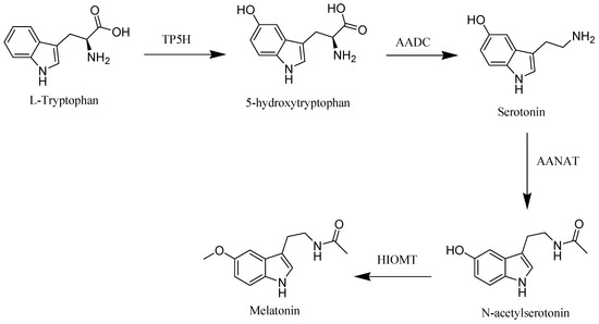 The starting material of melatonin biosynthesis in humans is tryptophan, an essential amino acid. Through the action of tryptophan hydroxylase (TP5H) and aromatic acid decarboxylase (AADC), enzymes tryptophan is converted to the neurotransmitter, serotonin. In the subsequent step, serotonin is converted into melatonin through the influence of arylalkylamine N-acetyltransferase (AANAT) and hydroxyindole-O-methyltransferase (HIOMT) enzymes [12] (Figure 1).