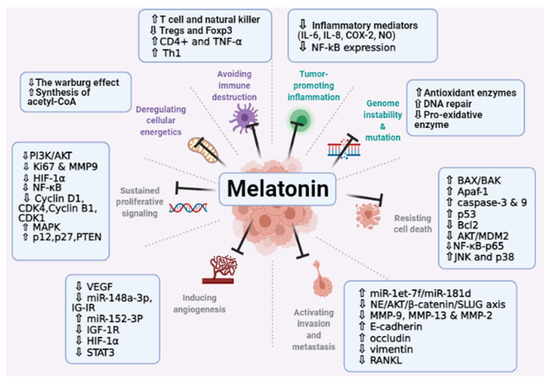 Cancer metastasis means that cancer cells spread away from the original tumor to surrounding tissues and distant organs. Multi-steps are involved in metastasis, including infiltration of tumor cells into the adjacent tissue, intravasation, traveling in the circulatory system, extravasation, and overproliferation in the competent organs [126]. Melatonin exhibited various mechanisms to restrain metastasis, such as modulation of cell–cell and cell–matrix interaction, extracellular matrix remodeling by matrix metalloproteinases, readjustment of the cytoskeleton, epithelial-mesenchymal transition, and angiogenesis [127]. A recent study reported that the overexpression of the ADAMTS family in renal cell carcinoma was suppressed by melatonin via amplifying of miR-let-7f/miR-181d and reducing protein stability. It is of note that ADAMTS, a disintegrin, and metalloprotease with thrombospondin motifs family, thought to have an impact on cell metastasis and developing of cancer stages [128]. Based on the Bu et al. results, melatonin inhibits chronic restraint stress-mediated metastasis of epithelial ovarian cancer by reducing the NE/AKT/β-catenin/SLUG axis [129]. Another mechanism of melatonin was inhibiting of matrix metallopeptidase 13 (MMP-13) in prostate cancer cells in both in vitro and in vivo [130]. Moreover, it was found that melatonin can hinder cancer-associated osteoclast differentiation via modulation of tumor-secreted RANKL expression in lung and prostate bone metastasis models [131]. Gu et al. revealed the anti-metastasis effect of melatonin against esophageal cancer. There was a reduction in MMP-9 expression along with a high level of E-cadherin and inhibition of the NF-κB signaling pathway [132]. Besides, the migration of human lung adenocarcinoma cell line A549 was suppressed after using melatonin. This inhibition is mediated by an increase in occludin expression [133]. Additionally, applying melatonin in breast cancer cells caused a decrease in the expression of vimentin and inhibition of cell migration [66]. It was also reported the inactivation of MMP-2 and MMP-9 signaling pathway in breast cancer cells treated with melatonin [134]. Figure 3 summarize the role of melatonin in cancer hallmarks.