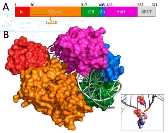 - Wang, L.K.; Nair, P.A.; Shuman, S. Structure-guided mutational analysis of the OB, HhH, and BRCT domains of Escherichia coli DNA ligase. J. Biol. Chem. 2008, 283, 23343–23352. [Google Scholar] [CrossRef] [PubMed]