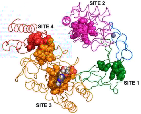 Molecular Operating Environment (MOE, Chemical Computing Group) molecular docking software [] was used to prepare an apo-EC-LigA structure. The bound nicked DNA-adenylated and three nonspecific sulphate ions were removed from the 2OWO [] crystal structure. A protonated and energy minimised apo-EC-LigA was prepared using MOE. The MOE site-finder tool was used to identify solvent-exposed sites with a volume > 5 Å3 within the apo-EC-LigA structure. Thirty-two sites were identified and four were selected as potential inhibitor target sites (Figure 2; Tables S2–S5). Small molecule accessible sites were visualised in PyMOL (Schrodinger Inc.). The functional significance of these four sites was assessed by comparing their amino acid composition and structural location to a series of mutational-mapping studies conducted by the Shuman group [,,,,] (Table S1; Figure S1) in PyMOL.