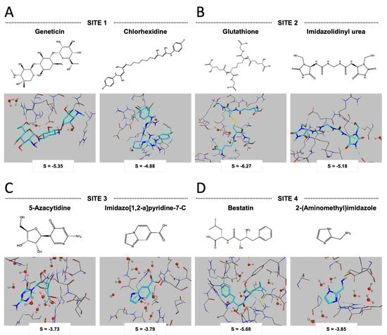 Molecular docking of small molecules into the potential inhibitor target sites of EC-LigA. The lowest energy EC-LigA-small molecule complexes for (A) geneticin and chlorhexidine docked into Site 1 (B) glutathione and imidazolidinyl urea docked into Site 2 (C) 5-azacytidine and imidazo[1,2-a]pyridine-7-C docked into Site 3 and (D) bestatin and 2-(aminomethyl)imidazole docked into Site 4. Small molecules are shown as cyan sticks with nitrogen coloured blue and oxygen coloured red. Amino acids in the potential inhibitor target site are shown as grey sticks with nitrogen coloured blue and oxygen coloured red. H2O molecules are shown as balls (oxygen, red; hydrogen, grey) and sticks. The docking score (S) for the complex, and the chemical structure of the small molecule, are also provided.