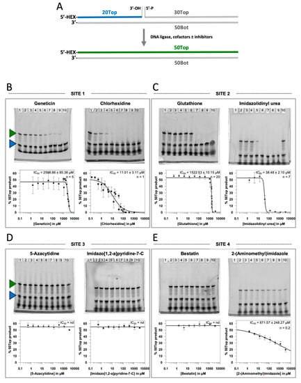 In order to determine whether the small molecules that docked into the potential inhibitor target sites in EC-LigA are able to inhibit EC-LigA, we decided to screen them using an in vitro ligase assay. A 50 bp nicked DNA substrate was designed and prepared by annealing a 5′ hexachlorofluorescein (HEX) labelled, 3′ hydroxyl 20 nt single stranded oligonucleotide (20Top) and an unlabelled, 5′ phosphate 30 nt single stranded oligonucleotide (30Top) to a complementary unlabelled 50 nt single stranded oligonucleotide (50Bot) (Figure 4A). Incubation of this nicked DNA substrate with EC-LigA in the presence of NAD+ cofactor should lead to phosphodiester bond formation between the 3′ hydroxyl of 20Top and the 5′ phosphate of 30Top to produce a 50 bp double stranded DNA product. The ligation reaction can be evaluated by resolving the 50 nt 5′ HEX labelled single stranded DNA and the 20 nt 5′ HEX labelled 20Top single stranded DNA by denaturing polyacrylamide gel electrophoresis (PAGE). The inhibitory activity of small molecules on EC-LigA activity can then be assessed by comparing the extent of ligation (the percentage of 50 nt 5′ HEX labelled single stranded DNA produced) in the absence of small molecule to the extent of ligation in the presence of small molecule. Small molecule inhibitors of EC-LigA will reduce the percentage of 50 nt 5′ HEX labelled single stranded DNA produced.