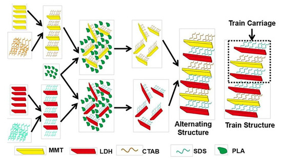 - Hu, Z.; Xie, R.; Li, M.; Lu, Z.; Xu, X.; Song, L.; Zhou, L.; Wu, Y.; Chen, M.; Zhao, X. Controlled synthesis of train-structured montmorillonite/layered double hydroxide nanocomposites by regulating the hydrolysis of polylactic acid. J. Mater. Sci. 2018, 53, 15859–15870. [Google Scholar] [CrossRef]