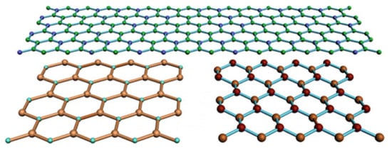 - Inorganic compounds: hexagonal boron nitride (h-BN), graphite phase nitrogen carbide (g-C3N4), boron carbon nitrogen, and various graphene derivatives.