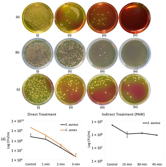 Bactericidal effect of direct microplasma treatment (a,b) and indirect treatment with PAW (c). (a) S. aureus; i. control, ii. 1 min, iii. 2 min, iv. 3 min. (b) C. acnes; i. control, ii. 1 min, iii. 2 min, iv. 3 min. (c) S. aureus; i. control, ii. 15 min, iii. 30 min, iv. 45 min. (d) Log reduction in survived bacterial colonies in CFU/mL for (left) direct treatment (right) and indirect treatment (PAW).
