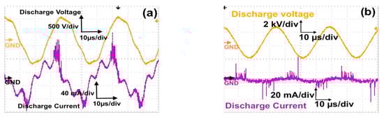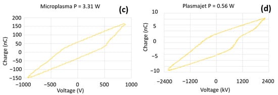 Discharge power was calculated using the charge–voltage curve (Lissajous curve) for high-frequency AC voltage. The applied voltage was measured with a Tektronix high-voltage probe (voltage ratio 1000:1), and the transferred charge was measured from the ground ceramic capacitor (100 nF), which was connected in series with the microplasma and plasma jet electrode. Figure 2c,d shows the Lissajours figure for microplasma and plasma jet discharge with the obtained optimum power of 3.31 W at 900 V, 27 kHz, and air working gas; and 0.56 W at 2.4 kV, 30 kHz, and 1.2% O2 working gas, respectively.