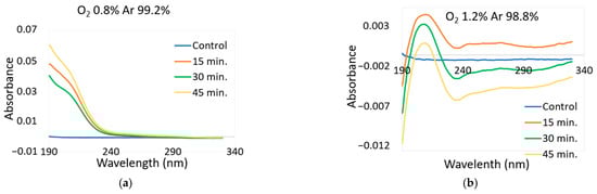 UV absorption spectra for PAW: (a) 0.8% O2 and 99.2% Ar; (b) 1.2% O2 and 98.8% Ar.