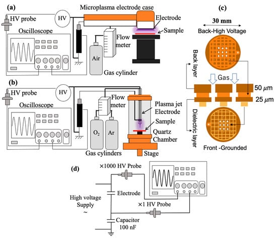 (a) DBD microplasma setup, (b) DBD microplasma electrode geometry, (c) plasma jet setup, and (d) transferred charge measurement setup.