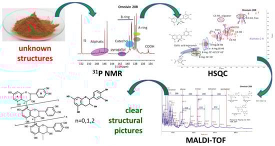 - Crestini, C.; Lange, H.; Bianchetti, G. Detailed Chemical Composition of Condensed Tannins via Quantitative 31P NMR and HSQC Analyses: Acacia Catechu, Schinopsis Balansae, and Acacia Mearnsii. J. Nat. Prod. 2016, 79, 2287–2295. [Google Scholar] [CrossRef] [PubMed]