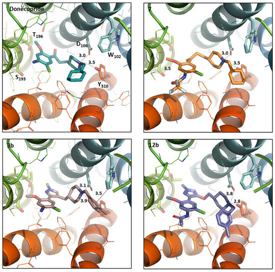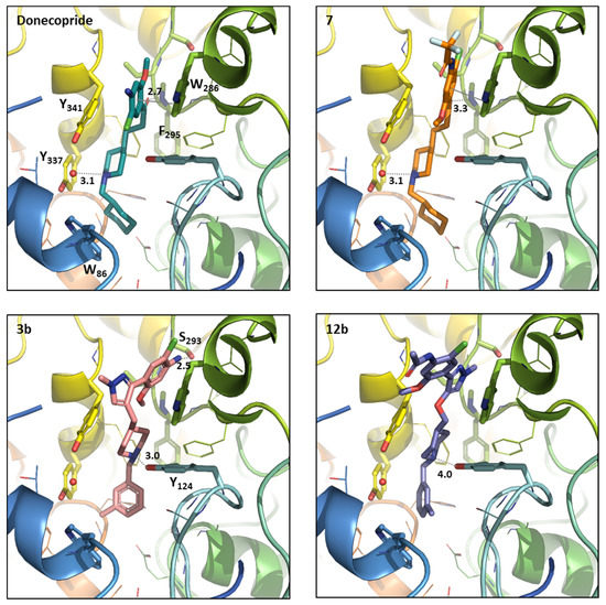 Donecopride (green) position compared to the compound 7 (orange), 3b (pink), and 12b (purple) positioned in hAChE binding sites using the docking studies. The compound and the selected side chains of the binding site residues are in stick and the protein in ribbon representation. This figure was made with PYMOL (DeLano Scientific, South San Francisco, CA, USA, 2002, San Carlo, Redwood City, CA, USA) and the protein is presented in the same orientation in all four images.