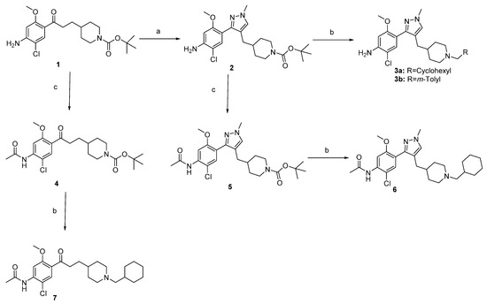 The access to targeted compounds was achieved starting from Boc-protected benzophenone 1 that we previously described (Scheme 1) [5]. The latter was treated by DMF–DMA [21] to generate an intermediate dimethyl enamines, which was not isolated, but reacted in boiling ethanol with methylhydrazine to generate the expected pyrazole 2 with 38% yield [22,23]. In order to obtain the final derivatives, the Boc protecting group was removed with TFA, and the resulted piperidine was alkylated with the appropriate bromide to generate the final cyclohexyl and m-tolyl substituted analog 3a–b. These particular substituents were chosen for a better comparison with either donecopride and MR33372. In order to verify the impact of the aniline both on the reactivity and the biological activities, the corresponding acetamides 4–5 were obtained in acetic anhydride with good yields. Following the same procedure, the cyclohexyl substituted analogs 6 and 7 were prepared after deprotection and alkylation (Scheme 1).