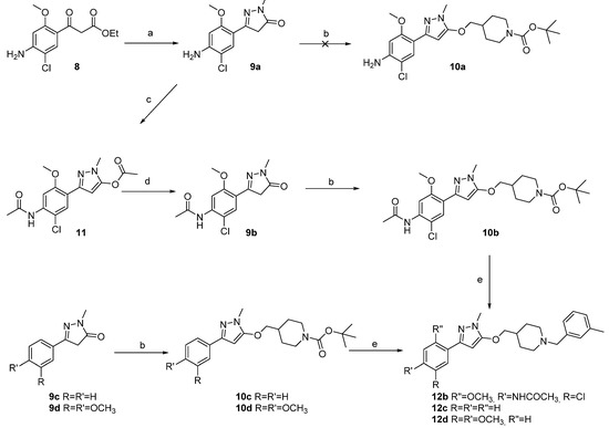 As already described in the benzisoxazole [20] and donecopride series [6], the influence of the linker could be of great importance on the ability of the ligand to bind to AChE. We then investigated the possibility to modulate both the linker and its position on the pyrazole ring. Indeed, the β-ketoester 8 is a crucial intermediate in the preparation of the benzophenone 1 and was then already available [6]. Afterwards, 8 was treated with methylhydrazine in refluxing ethanol to obtain the pyrazolone 9a with 57% yield (Scheme 2). Unfortunately, the O-alkylation procedure tested was ineffective to generate the expected piperidine 10a, due to the reactivity of the aniline moiety. The pyrazolone 9a was then treated with acetic anhydride to obtain the ester 11 with 94% yield, before being hydrolyzed with LiOH to generate the acetamide 9b. The latter was then alkylated with N-Boc 4-iodomethylpiperidine in DMF to generate this time the expected ether 10b with good conversion. Finally, the protecting group was removed with trifluoroacetic acid, and the m-tolyl analog 12b was obtained after an N-alkylation reaction with the corresponding bromide. Unfortunately, all attempts aiming at deprotecting the N-acetamide group of 12b failed. In order to verify this time the impact of the substitution of the aromatic ring, commercial pyrazolone 9c–d were engaged in the same procedure. The 3-4-dimethoxyphenyl group of 9d was chosen by analogy with donepezil, a reference AChE inhibitor (AChEI). The expected m-tolyl analogs 12c–d were obtained in a two-step synthesis.