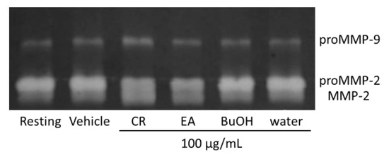 Effects of crude extracts and partitioned parts of A. sinensis leaves on MMP-2 and MMP-9 activity. Results of gelatin zymography. CR, crude extracts; EA, ethyl acetate layer; BuOH, butanol layer; water, water layer.