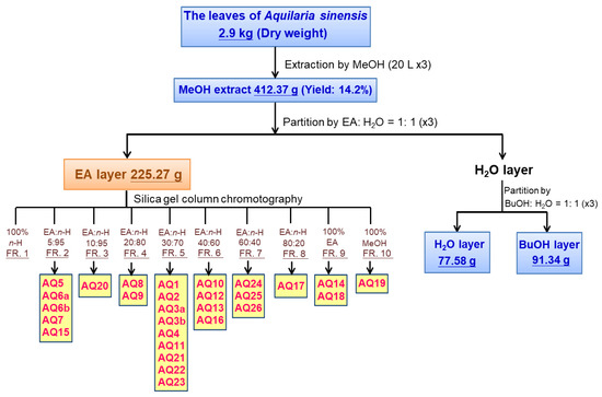 Flow diagram of bioassay-guided procedure. Bioassay-guided fractionation and isolation of the MeOH extract of the leaves of A. sinensis resulted in the isolation of 28 compounds.