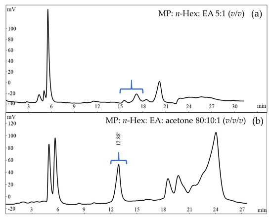 The fraction 2 was eluted with n-Hex/EA (95:5, v/v) and 20 bottles were collected. The eluents were purified by HPLC on a semi-preparative normal-phase column at a flow rate of 3 mL/min and afforded 5 (59.0 mg, RT 22.2 min with n-Hex/EA (99:1, v/v)), 6a + 6b (323.4 mg, RT 18.6 min with n-Hex/EA (90:10, v/v)), 7 (57.2 mg, RT 27.9 min with n-Hex/EA (90:10, v/v)), and 15 (249.3 mg, RT 6.13 min with n-Hex/EA (99:1, v/v)).
