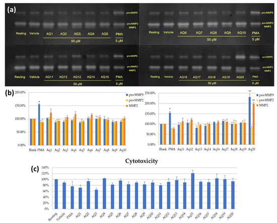 Effects of the isolated compounds AQ—AQ20 on MMP-2 and MMP-9 activity and cytotoxicity. (a) Results of gelatin zymography. (b) Activity of the compounds on MMPs expression. (c) Cell viability test. Data represent the mean ± SD (n = 3). PMA (5 μΜ); AQ1—AQ20 (50 μΜ); * p < 0.05, ** p < 0.001.