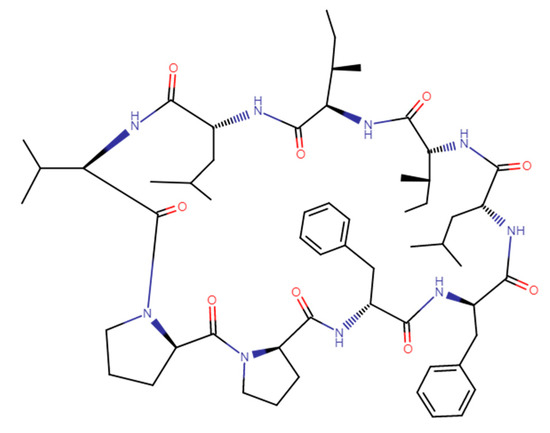 A cyclic nonapeptide Cyclolinopeptide A (CLA) was isolated from linen seeds oil [1]. The structure of CLA, cyclo-(Leu1-Ile2-Ile3-Leu4-Val5-Pro6-Pro7-Phe8-Phe9-), is presented in Figure 1.