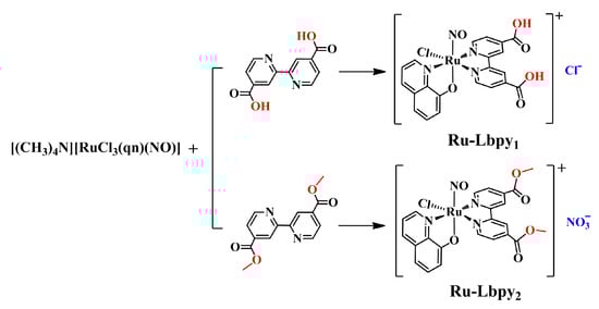 3.3.2. Synthesis of [RuCl(qn)(Lbpy2)(NO)]NO3 (Ru-Lbpy2)