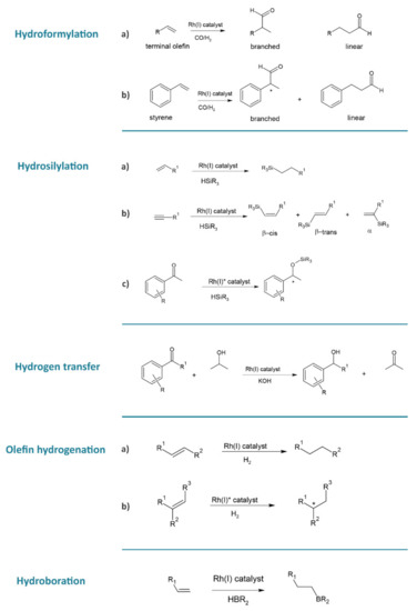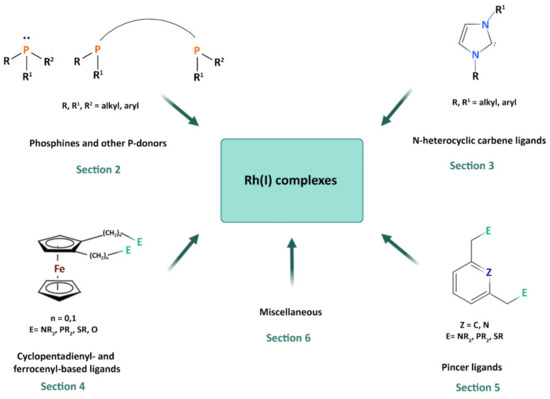 The exigence of decreasing the environmental and economic impact of metal-catalyzed industrial processes led to the search of alternatives to classic homogeneous catalysis carried out in organic solvents. Consolidating trends are the incorporation of Rh complexes in nanomaterials, use of biphasic media, and immobilization onto solid supports, just to quote some [16]. In this review, temporally restricted to the analysis of literature during the past five years, the latest findings and trends in the design and applications of Rh(I) complexes to catalysis will be presented.