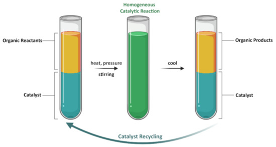 The possibility to carry out catalytic processes in biphasic systems, where the catalyst is immobilized in a different phase from the products and substrate, offers the opportunity of an effective recycling of the complex without having to append it onto a solid support. Aqueous and fluorous biphasic catalysis have been developed in this perspective. The latter is carried out in a system composed by the organic phase, consisting of a generic organic solvent, and the fluorous phase, consisting of a fluorinated solvent in which the fluorocarbon-containing catalyst is dissolved [37,38,39]. At room temperature, the two phases are immiscible, while by raising the temperature they turn into a single homogeneous mixture, allowing the catalyst and the substrate to react together. Once the temperature is lowered again, catalyst and product can be easily separated, each in a different phase (Scheme 4).