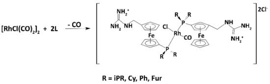 Another example of phosphino-ferrocenes is given by the series of derivatives carrying a highly polar and positively charged guanidinium moiety onto the 1′-position, with the aim of increasing their affinity towards polar solvents. The hydrophobic phosphino group at the 1-position, on the other hand, was modified with both alkyl or aryl substituents [69] (Figure 3). The relative Rh(I) species, to which two ligands are bonded in a monodentate fashion (Scheme 7), were tested in the hydroformilation of 1-hexene, with yields going from moderate (42%) to high (98%) according to the substituent on the phosphorus atom.