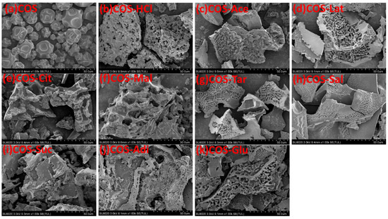 Scanning electron photomicrographs of: (a) Pure chitooligosaccharides (COS), (b) chitooligosaccharide hydrochloride (COS-HCl), (c) Chitooligosaccharide acetate (COS-Ace), (d) chitooligosaccharide lactate (COS-Lat), (e) chitooligosaccharide citrate (COS-Cit), (f) chitooligosaccharide malate (COS-Mal), (g) chitooligosaccharide tartrate (COS-Tar), (h) chitooligosaccharide acetylsalicylate (COS-Sal), (i) chitooligosaccharide succinate (COS-Suc), (j) chitooligosaccharide adipate (COS-Adi), and (k) chitooligosaccharide glutamate (COS-Glu).
