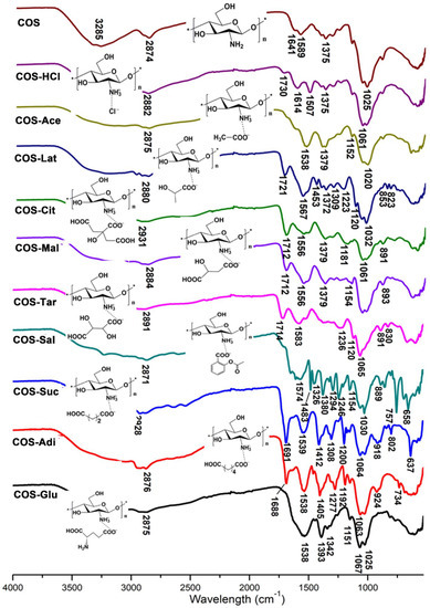 Fourier transform infrared (FTIR) spectrum of chitooligosaccharide and its salts was measured in the 4000–400 cm−1 regions using a Thermo Scientific Nicolet iS10 FTIR spectrometer (Thermo Fisher Scientific Inc., Waltham, Ma, USA) and KBr discs.