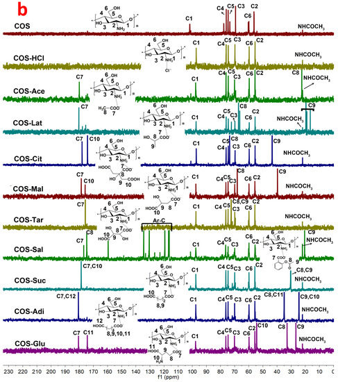 1HNMR and 13CNMR spectra were recorded on a 500 MHz Agilent DD2 500 spectrometer for structural analysis in chitooligosaccharide and its salts. Measurements were recorded at 25 °C. Samples were dissolved at D2O (10 mg/mL) and pulse sequence was s2pul, relaxation delay was 1.0000 s. Acquisition time was 2.0447 s with 16 scans and spectral width was 8012.8 Hz for 1HNMR. Acquisition time was 1.0486 s and spectral width was 31,250 Hz for 13CNMR. For 13CNMR, number of scans of different samples are different. Number of scans of each sample are as follows: (a) COS: 7264, (b) COS-HCl: 640, (c) COS-Ace: 1192, (d) COS-Lat: 808, (e) COS-Cit: 8500, (f) COS-Tar: 5000, (g) COS-Mal: 744, (h) COS-Sal: 5000, (i) COS-Suc: 8500, (j) COS-Adi: 5000, and (k) COS-Glu: 1240.