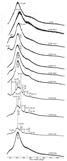 Figure 4 shows the X-ray diffraction patterns of the pure COS and its different salt form samples ranging from 5 to 80°. The X-ray diffraction pattern of the initial chitosan has two characteristic peaks at 2θ = 10.4° and 20.0° [18,28,29,30]. Compared with the original chitosan, COS becomes amorphous due to the decrease of crystallinity, and only one absorption peak appeared at 2θ = 22.4° [28,31]. As shown in Figure 4, the main characteristic peaks of different salt type chitooligosaccharides are about 2θ = 22.4°, which is consistent with the main characteristic absorption peak of pure COS. However, some salt type chitooligosaccharides have characteristic absorption peaks of related acid types due to the influence of acid types. In the case of COS-HCl, the peak at 2θ = 23.14° became low and broad, which indicated that the crystallinity of the chitooligosaccharide salt had been further decreased. This might be explained by the fact that the formation of –NH3+Cl− caused the deformation of the hydrogen bonds in COS molecules [32]. However, for COS-Ace, COS-Lat, COS-Cit, COS-Mal, COS-Tar, and COS-Glu, the intensity of the peak of each sample increased compared with pure COS. This might be because the carboxyl group and hydroxyl group contained in the acid form hydrogen bonds with some hydroxyl groups in the chitooligosaccharide after the introduction of different acid forms into the salt, thus increasing the crystallinity of these salt type chitooligosaccharides. Furthermore, in the case of COS-Sal, COS-Suc, and COS-Adi, because of the introduction of acetylsalicylic acid, succinic acid, and adipic acid in the salt form of chitooligosaccharides, their crystal structures were also reflected in XRD. For example, the new peaks of 10°, 17°, 25°, 28°, and 30° of COS-Sal were speculated as the aromatic ring structure of acetylsalicylic acid. Due to the similar structure of succinic acid and adipic acid, COS-Suc and COS-Adi showed new peaks at 26° and 31°. However, the other peaks in COS-Sal, COS-Suc, and COS-Adi might represent the packing structure induced from a pi–pi stacking or aromatic–aromatic interaction of Phe [33].