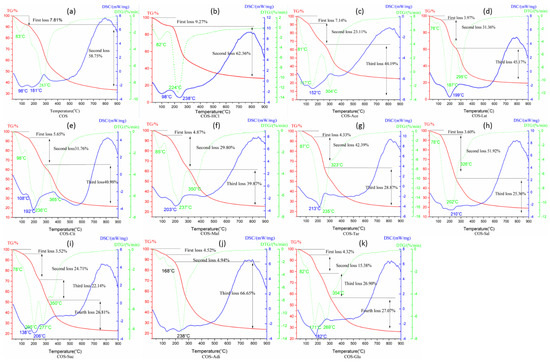 Thermal behavior of chitooligosaccharide and its salts. (a) Pure chitooligosaccharides (COS), (b) chitooligosaccharide hydrochloride (COS-HCl), (c) Chitooligosaccharide ace-tate (COS-Ace), (d) chitooligosaccharide lactate (COS-Lat), (e) chitooligosaccharide citrate (COS-Cit), (f) chitooligosac-charide malate (COS-Mal), (g) chitooligosaccharide tartrate (COS-Tar), (h) chitooligosaccharide acetylsalicylate (COS-Sal), (i) chitooligosaccharide succinate (COS-Suc), (j) chitooligosaccharide adipate (COS-Adi), and (k) chitooligo-saccharide glutamate (COS-Glu).