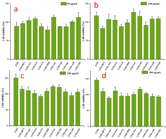 The effects of chitooligosaccharide and its salts on cell viability. RAW 264.7 cells were treated with chitooligosaccharide and its salts (50–500 μg/mL) for 24 h. (a) 50 μg/mL; (b) 100 μg/mL; (c) 200 μg/mL; (d) 500 μg/mL. The values are presented as the mean ± SD (n = 3, which refers to the number of replicates).