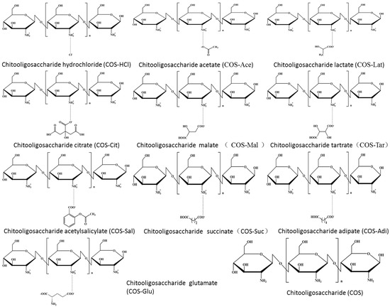 Ten kinds of chitooligosaccharide salts, such as chitooligosaccharide hydrochloride, chitooligosaccharide lactate, chitooligosaccharide citrate, chitooligosaccharide glutamic acid salt, etc., were prepared. Their structures were analyzed by means of SEM, FTIR, NMR, and other modern analysis techniques. The characteristic peaks of each salt type of chitooligosaccharides corresponding to the acid type were determined. Their cytotoxicity and immune activity were studied. It was found that they had no cytotoxicity and could promote the growth of cells and could promote the secretion of NO by macrophages. Pure chitooligosaccharides had the best effect on promoting the growth and secretion of NO, which may be related to the high content of glucosamine at the same concentration, but the specific reasons need to be further studied.