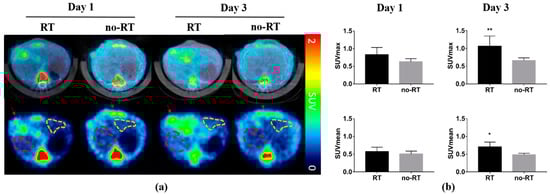 18F-FDG PET/CT scans were conducted on post-RT days 1 and 3 to monitor the 18F-FDG uptake in the liver parenchyma of mice bearing experimental HCC with 5 mm of tumor size. Animals in the no-RT group served as controls. Representative transaxial planes of liver CT and 18F-FDG PET/CT images obtained in the two experimental groups are shown in Figure 1a. On post-RT day 1, a mildly increased 18F-FDG uptake was observed in the right liver parenchyma of irradiated mice. On post-RT day 3, the 18F-FDG uptake in the right liver parenchyma was significantly higher in the irradiated group compared with the non-irradiated group (SUVmax: 1.06 ± 0.29 versus 0.66 ± 0.08, respectively, p < 0.01; SUVmean: 0.71 ± 0.13 versus 0.49 ± 0.04, respectively, p < 0.05; Figure 1b). However, there was no significant increased in 18F-FDG uptake in the left liver parenchyma in neither RT group nor no-RT group following irradiation (Figure S1). In experiments conducted in tumor-free animals, the right-to-left ratio of 18F-FDG uptake in the liver parenchyma measured on post-RT day 3 was 1.13-fold higher in the RT group compared with the no-RT group (1.11 ± 0.10 versus 0.98 ± 0.03, respectively, p < 0.05, Figure S2).